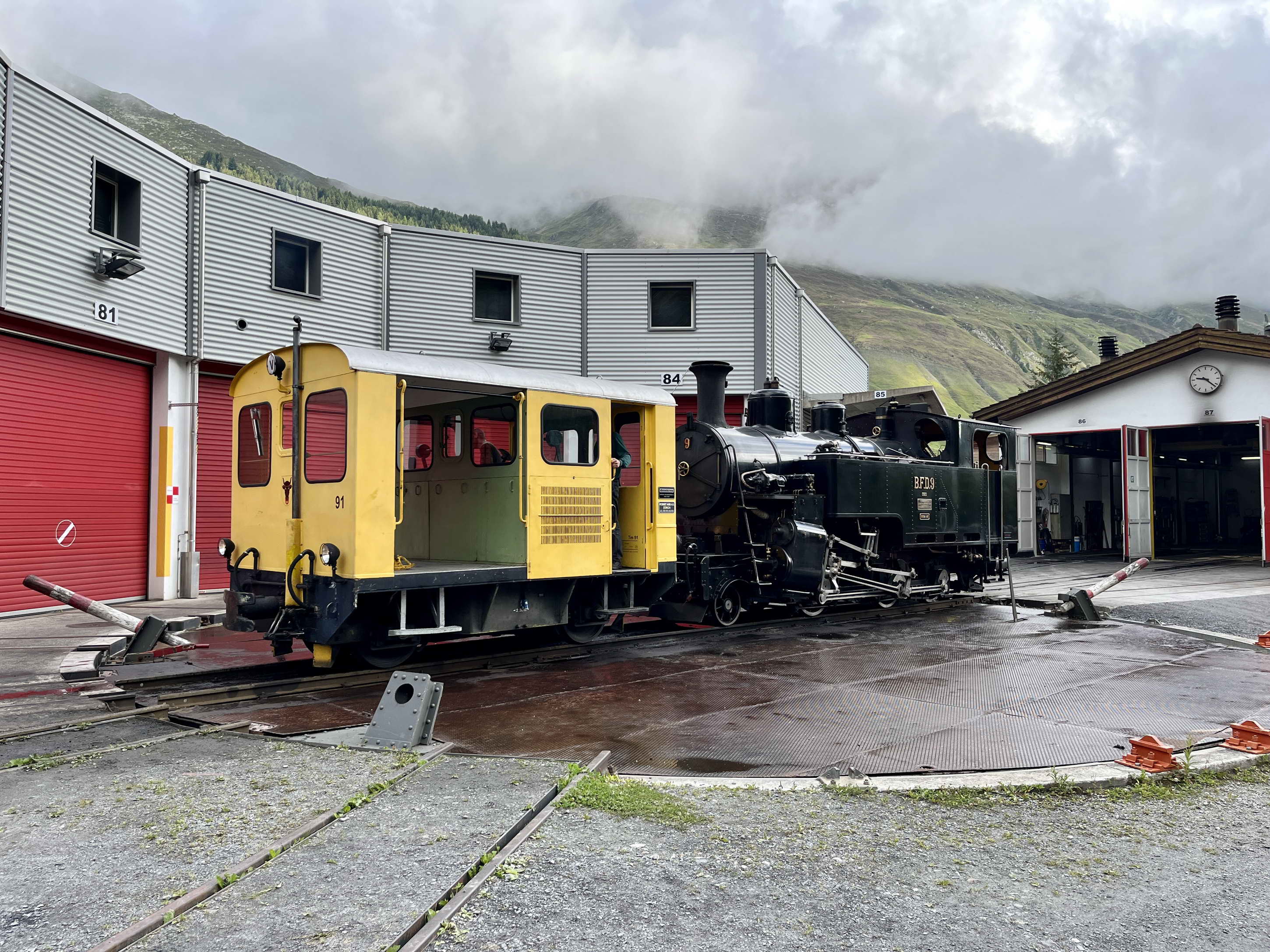 Der Tm 91 zieht die HG 3/4 BFD 9 auf die Drehscheibe
