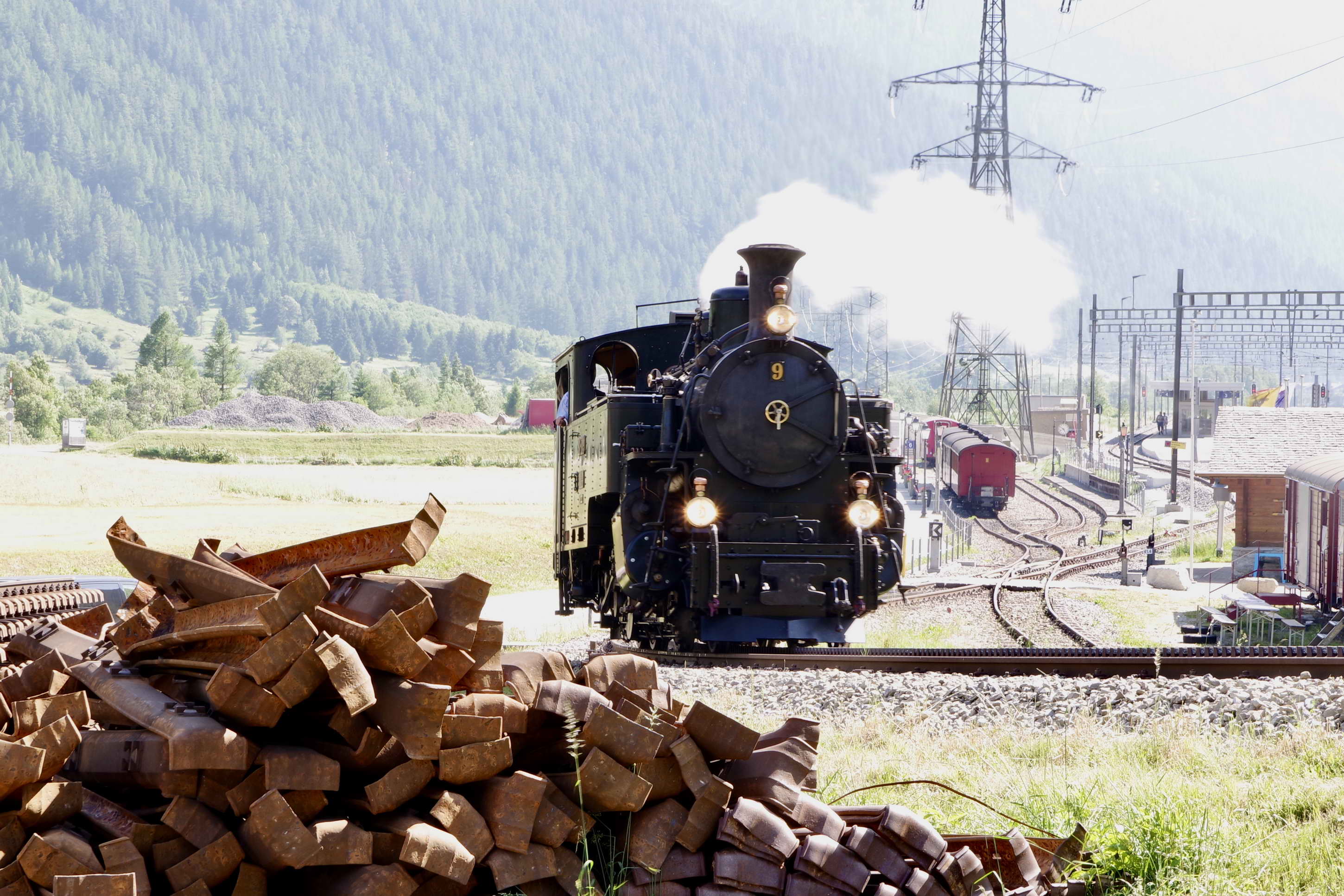 Am Spätnachmittag ist Lok 9 wieder mit ihrem bunten Zug in Oberwald.